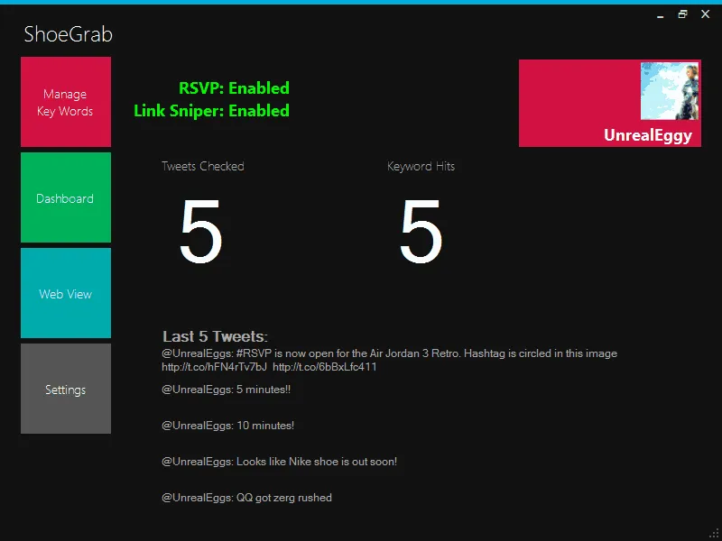 ShoeGrab lytte til livestreamen af tweets og brugte Tesseract/OpenCV/OCR til at finde hashtagget, der var cirklet i billedet med skoen. Jeg trænede applikationen på nogle eksempler og finjusterede billedprocessen, så baggrundsstøj blev fjernet mest muligt.