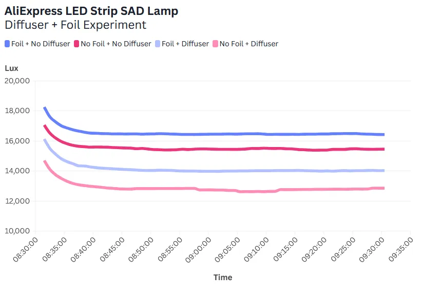 Now, the LED strip is the main component. According to OptimizeYourBiology, it produces the following Lux depending on the foil and diffuser configuration at 1 foot (30-ish cm).