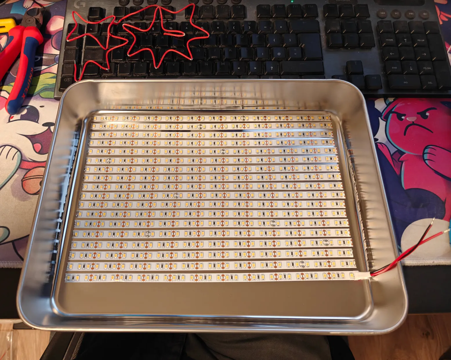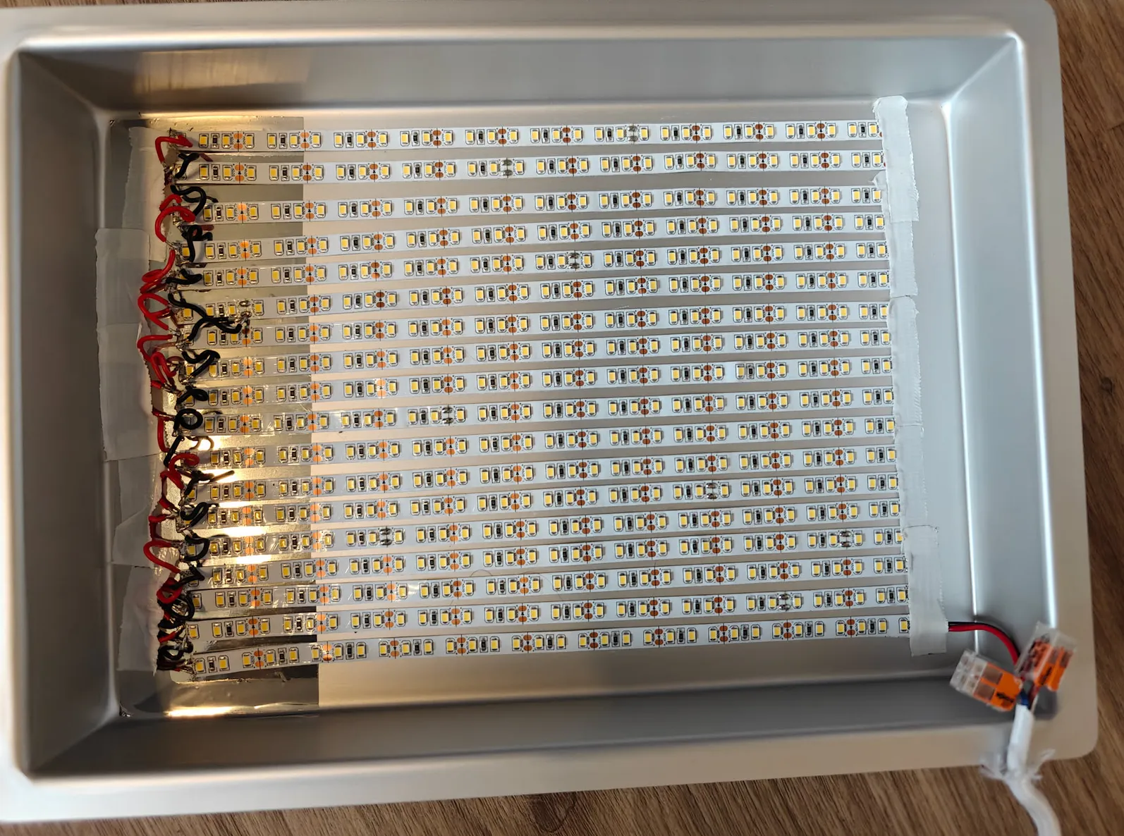 Wooo! It really felt like looking at the sun. The picture doesn’t really show how bright it is. I let it run for some time, and man. It was getting VERY HOT, as in too hot to touch. I realized I had bought a steel cake tin, and not an aluminum one… So after waiting for a new delivery, I moved it all over. Which luckily, mostly all the solder had survived the move.